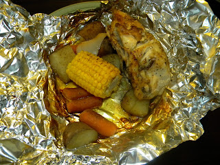 Prepare a separate foil packet for each person. Set the seasoned chicken in the middle of a large piece of heavy duty foil, surround it with your favorite veggies. I use corn on the cob, onion, potatoes (peeled for the picky 8 year old), and carrots. Sprinkle those with seasoning and add about two tablespoons of butter (add a little more for the wings and legs since they don’t make as much juice).