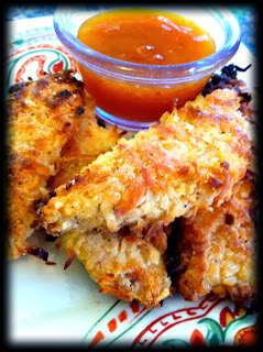 Place some of your chicken strips in the hot oil. Be sure to leaved space between each strip. Fry them until golden brown. Drain them on a paper towel. Move to an ovenproof dish.