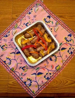 Turn the sausage, then lay the pepper strips on top. Sprinkle with oregano and drizzle with a little olive oil. Cook for 30 minutes.