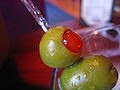 Once you’re satisfied with your shaking, quickly spear a couple of olives with a toothpick; personally I like three olives on the stick. Place the skewered olives in the martini glass and then gently pour your drink over them. If you’ve never used a martini shaker before, the ice stays in it. Depending on the model you have, the top may have a built in strainer, or if you prefer a hand held one, that’s cool too.