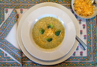 Melt butter in a 3-4 quart saucepan. Add all the broccoli pieces, onions, and red peppers. Sauté until soft, about 5-7 minutes. Do not let the onions brown or the soup will be bitter.