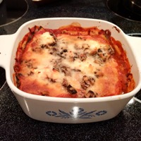 On top of this base, layer ⅓ cup pasta sauce, ¼ cup shredded mozzarella cheese, ⅓ cup mushrooms, a handful of spinach, and four tablespoons of ricotta cheese (dotted over the top of the spinach), and enough zucchini slices to cover the ingredients. Spread the ingredients so they are evenly layered. Repeat layers to the depth the dish allows, ending with a layer of zucchini, sauce, ricotta cheese and mozzarella cheese.