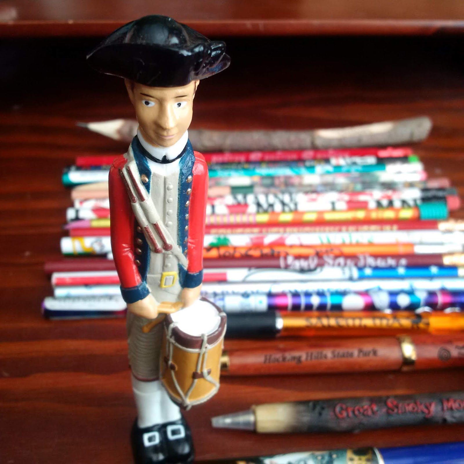 As I writer, I collect pencils when I travel – pens too. You can see some of my pencils and pens in the collection above. The soldier at the forefront is a standing pen from Colonial Williamsburg. I think he’s absolutely adorable!