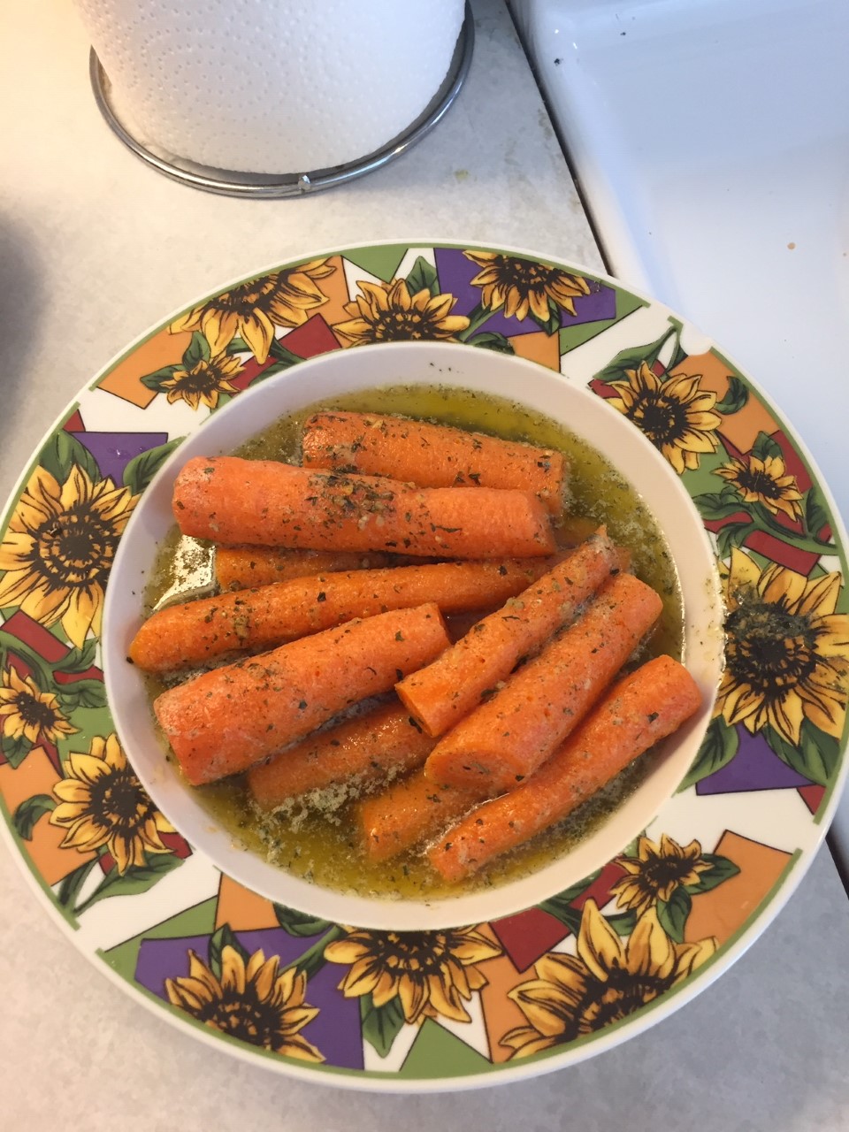 The day you want to use the carrots, remove them from the plastic bag and place them into an ovenproof dish. Turn the oven on 350° F, and then prepare the rest of your meal. When dinner is ready to serve, so are your carrots.