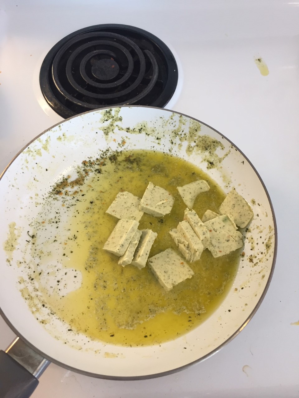 Warm garlic, butter, and cilantro in a frying pan on medium heat. *I use cilantro because my husband is from Costa Rica, but you can use Italian or regular parsley if that’s better for you.