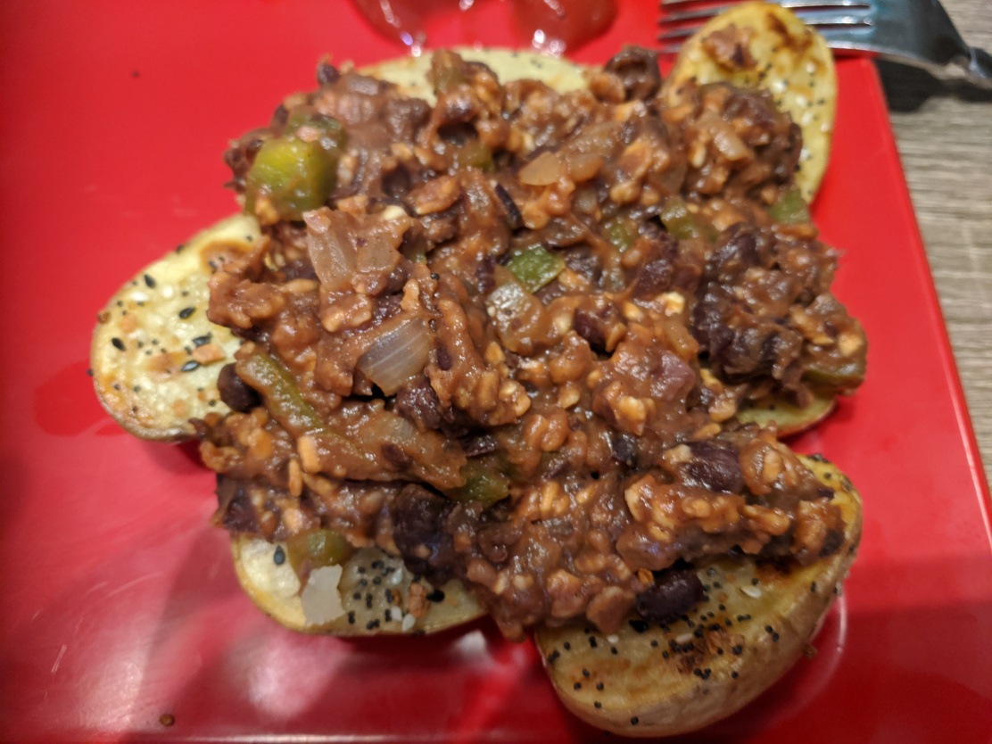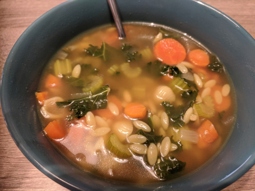 Today’s meal was a simple carrot, celery, kale, and noodle soup followed by black bean sloppy joes over roasted potatoes.