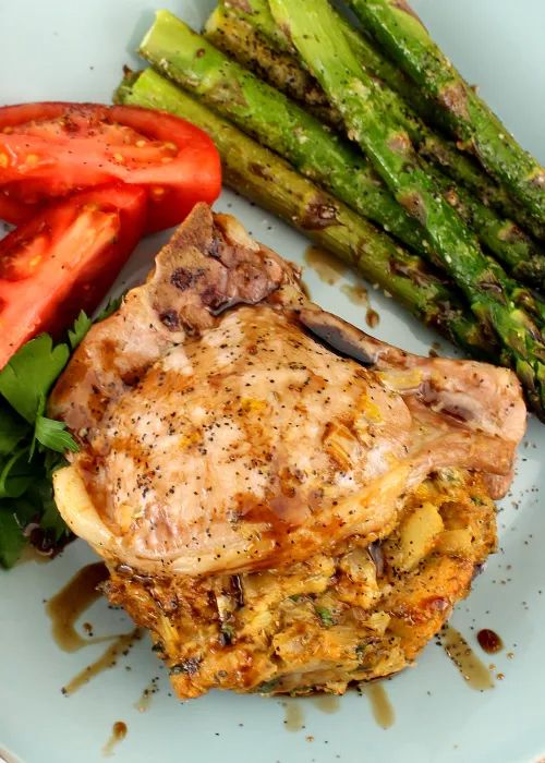 Slice a deep pocket in each chop. Pack in stuffing. Use toothpicks to hold pocket closed as much as possible by inserting down through both layers of meat at one end then up as close as possible. You’ll use 2 toothpicks per chop.