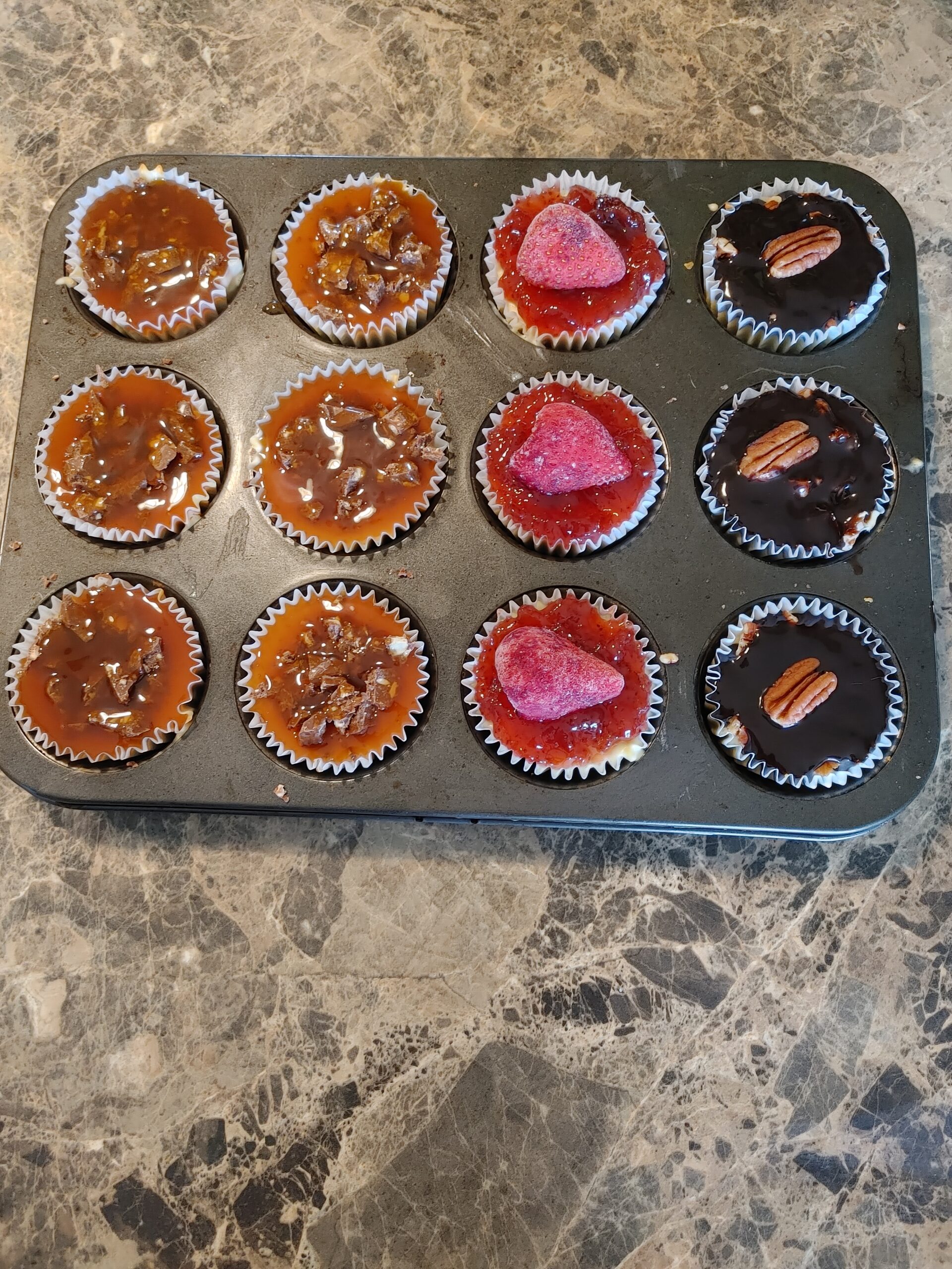 Depending on what you choose for a topping: spread caramel topping over cheesecake just before serving and garnish with chopped chocolate or pecan halves, or add a dollop of your favorite pie filling, and enjoy!