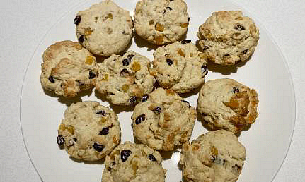 Mix flour, butter, sugar, and currants. Moisten into a stiff paste with eggs, orange-flower water, rose water, sweet wine, and brandy. Drop the paste onto a floured tin plate, and a short time will bake them.