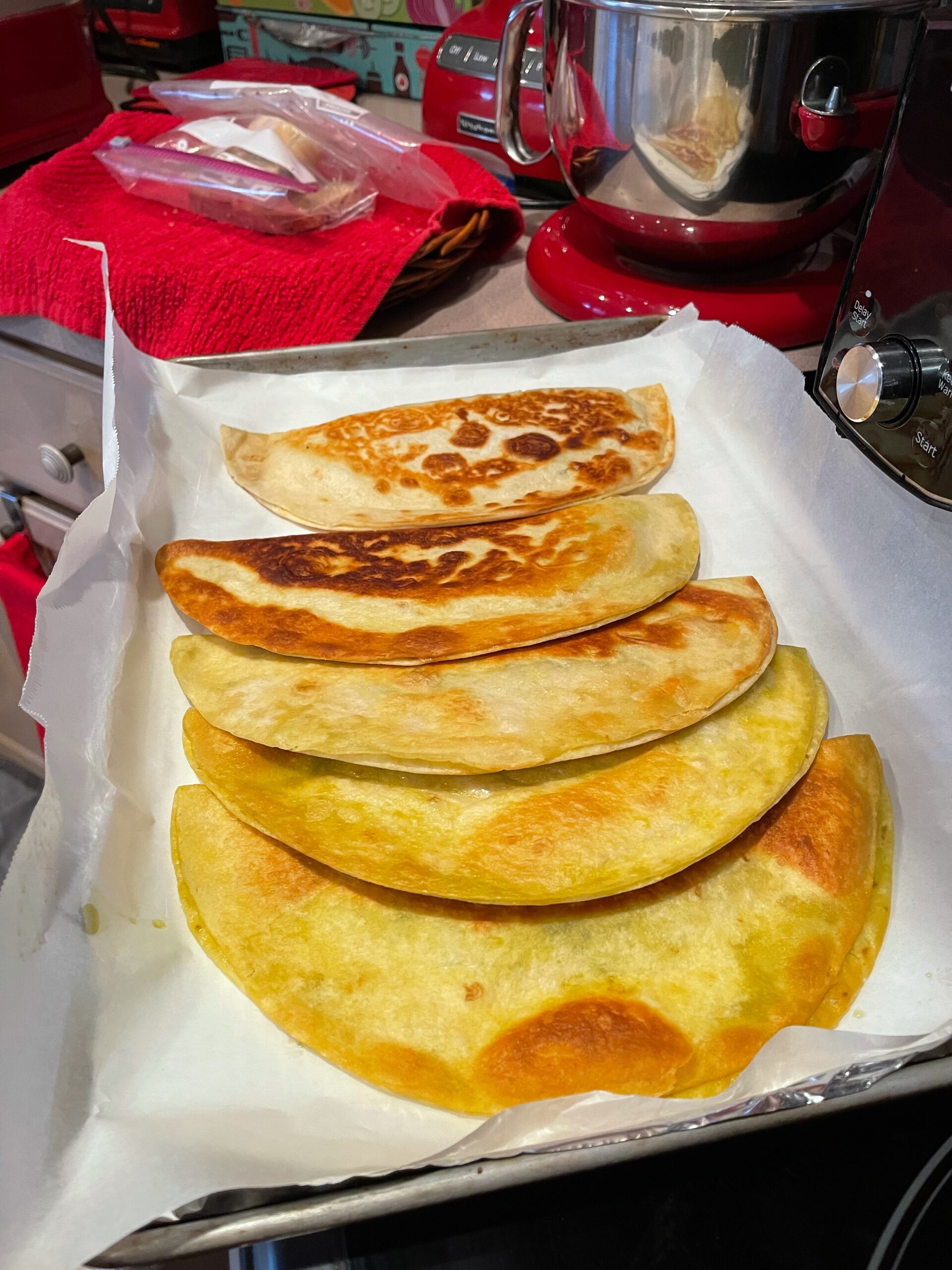 Beat the egg in a small bowl. Fill half of a tortilla with stuffing, leaving a little bit space at the edges. I measure it by handfuls and use 2 handfuls for each Kutab. Use a brush to apply egg to the edges. Fold tortilla in half and then press with your fingers to make the edges stick together.