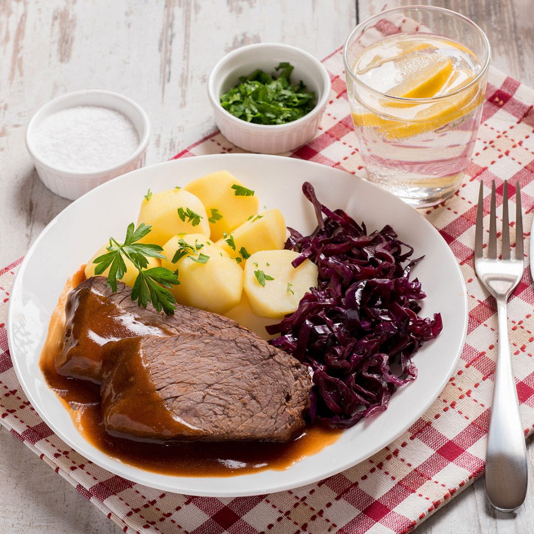 Trim excess fat from roast. Set beef in a deep flat bowl or pot just large enough to hold it comfortably. Pour marinade over the top. Add more wine if marinade is not halfway up the sides of the meat. Turn meat to moisten all sides. Cover pan tightly with foil or cling wrap. Refrigerate for 2 – 3 days. Be sure to turn the meat over at least twice a day.