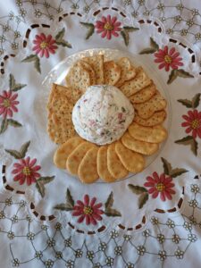 When you’re ready to serve, place the unwrapped cheeseball on a plate then surround it with crackers. Sociables or any baked savory cracker works best.